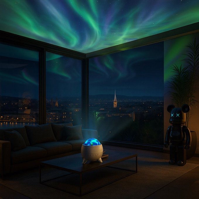 Le Projecteur Aurore Boréale transforme vos soirées en véritables parenthèses hors du temps. Entre aurores, lune et ambiances spatiales, la lumière se mêle aux sons relaxants pour envelopper la pièce.
